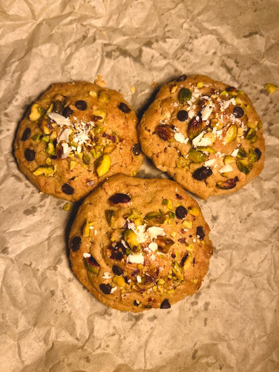 Each cookie is crafted with a soft, buttery dough infused with creamy white chocolate and folded with premium chocolate chips that stay whole without melting. The outside is coated generously with crushed pistachios for the perfect nutty crunch.